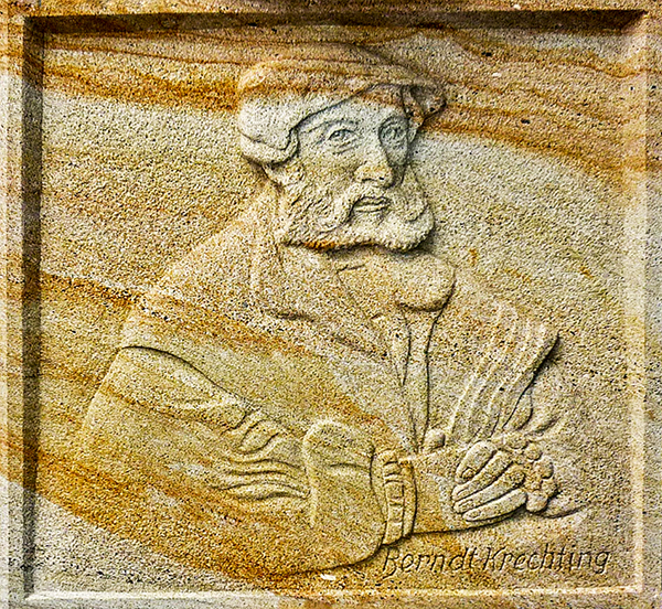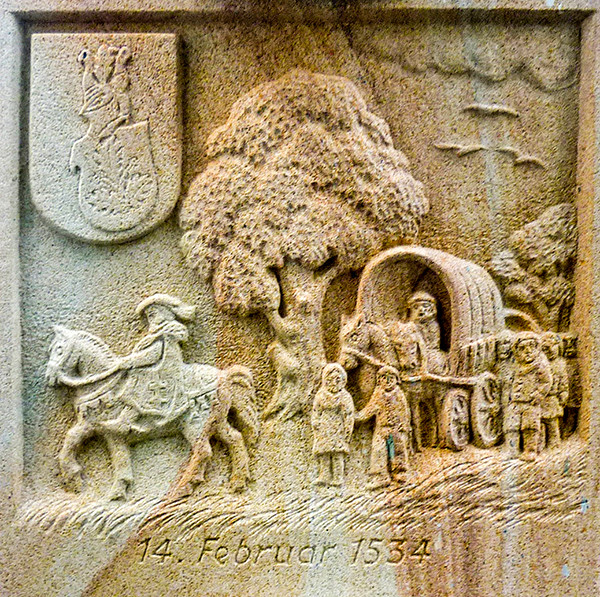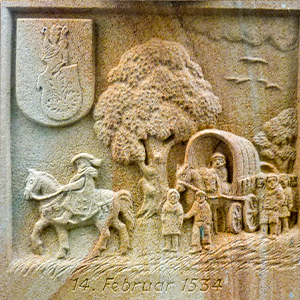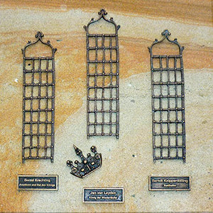 Reliefs zeigen den Auszug der Schöppinger sowie Bernd Krechting und Jan van Leiden.