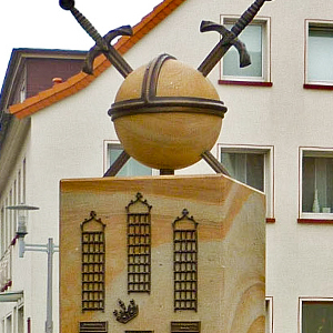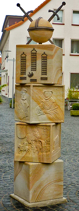 aus vier Sandsteinquadern aufgestellt. Darüber sieht man die Wappenkugel des Wiedertäuferkönigs.